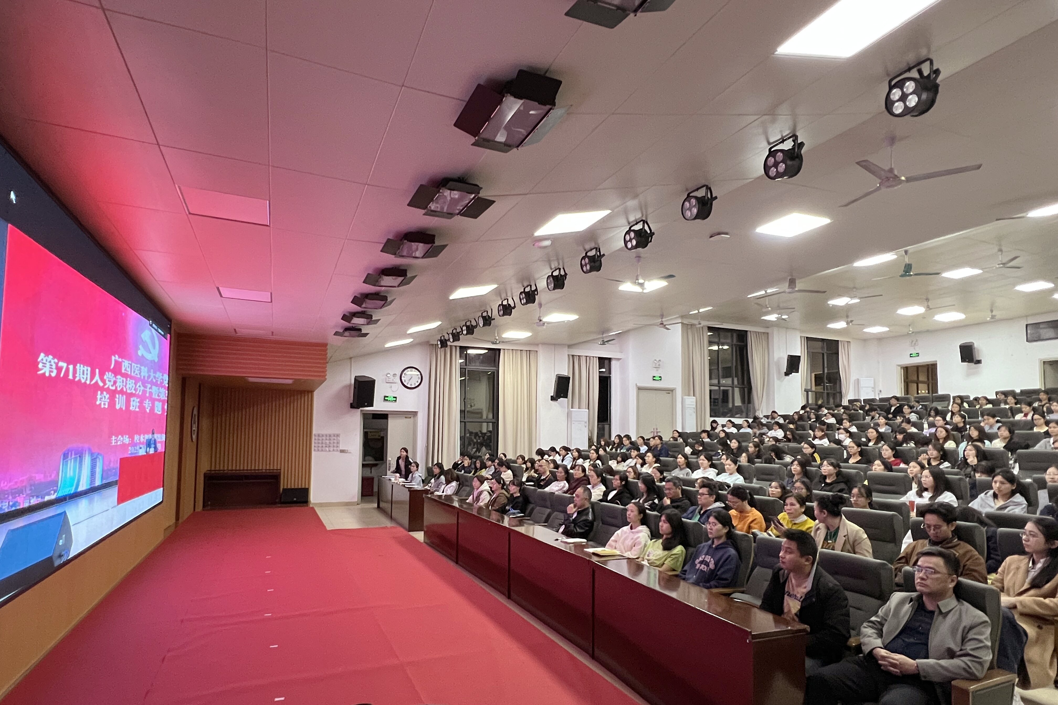 • 12月17日晚,我校党校第71期入党积极分子暨第32期预备党员培训班专题党课开讲,学校党委书记陈川专题授课。主会场设在校本部图书馆演讲厅,武鸣校区、玉林校区设分会场,通过视频形式同步直播。陈川以《端正入党动机,走稳“向党”之路》为题,从“信党、爱党、为党”三个维度为学员们作专题辅导。授课中,他结合学校党委致2025级新生的一封信——《党旗指引,医路前行》的鲜活实践,深刻指出从“向党”到“入党”绝非一蹴而就,只有持续对照党员标准、不断缩小自身差距、深化思想改造的长期过程,才能真正做到组织上入党一生一次,思想上入党一生一世。